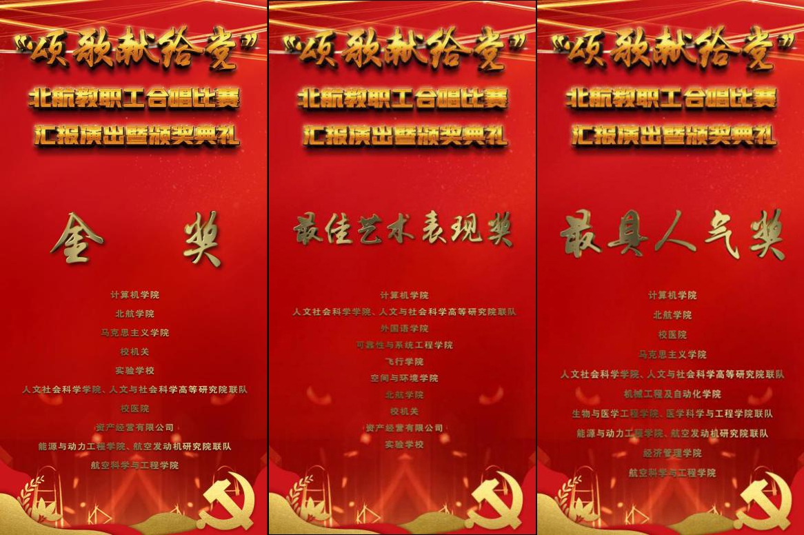 2021年6月26日晚19点,由校工会主办的“北航教职工‘颂歌献给党’合唱比赛汇报演出暨颁奖典礼”在北航晨兴音乐厅隆重举行,球盟会、人文与社会科学高等研究院联队获得了最高荣誉“金奖”,以及“最佳艺术表现奖”和“最具人气奖”共三项大奖。