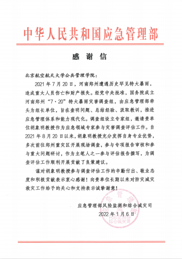 感谢信中提到,胡象明教授和詹承豫教授在河南郑州“7·20”特大暴雨灾害发生之后充分发挥自身专业优势,加入调查组,并多次前往郑州重灾区开展现场调查,参与专项报告审核和重大问题研讨,作为主笔人撰写评估报告,为调查评估工作顺利开展贡献了良策建议。感谢信中特别表扬到,胡象明教授和詹承豫教授工作严谨细致、认真负责,表现出过硬的专业技术水平,对应急管理部参与开展的调查工作给予了有力支撑,为顺利完成调查工作做出了突出贡献。