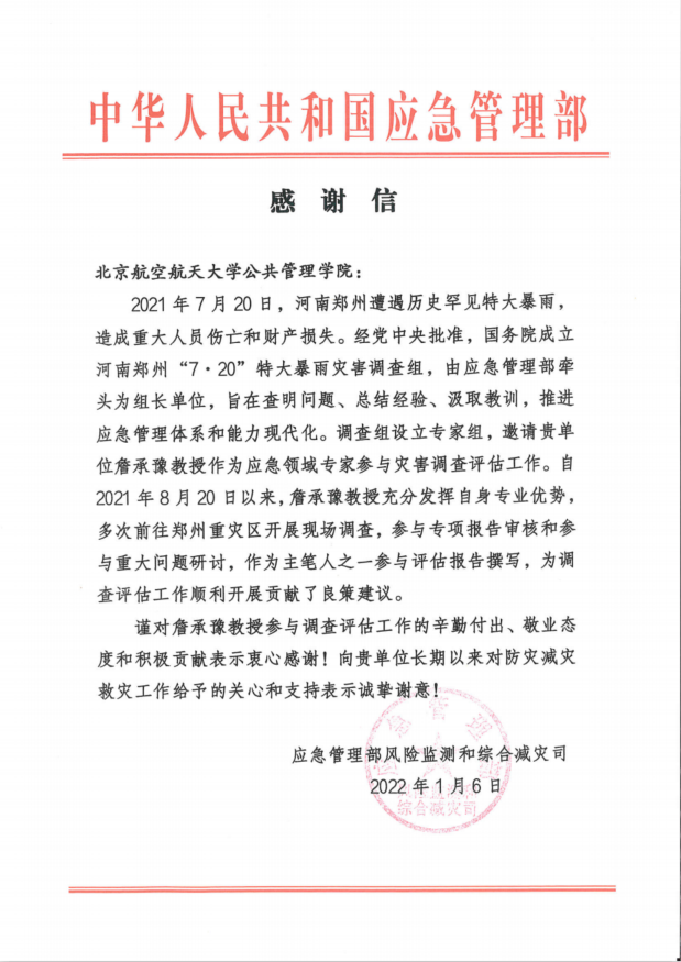近日,球盟会公共管理公司收到来自应急管理部风险监测和综合减灾司的两封感谢信。感谢公司胡象明教授和詹承豫教授参与河南郑州“7·20”特大暴雨灾害调查的辛勤付出、敬业态度和积极贡献,感谢公司长期以来对防灾减灾救灾工作给予的关心和支持。
