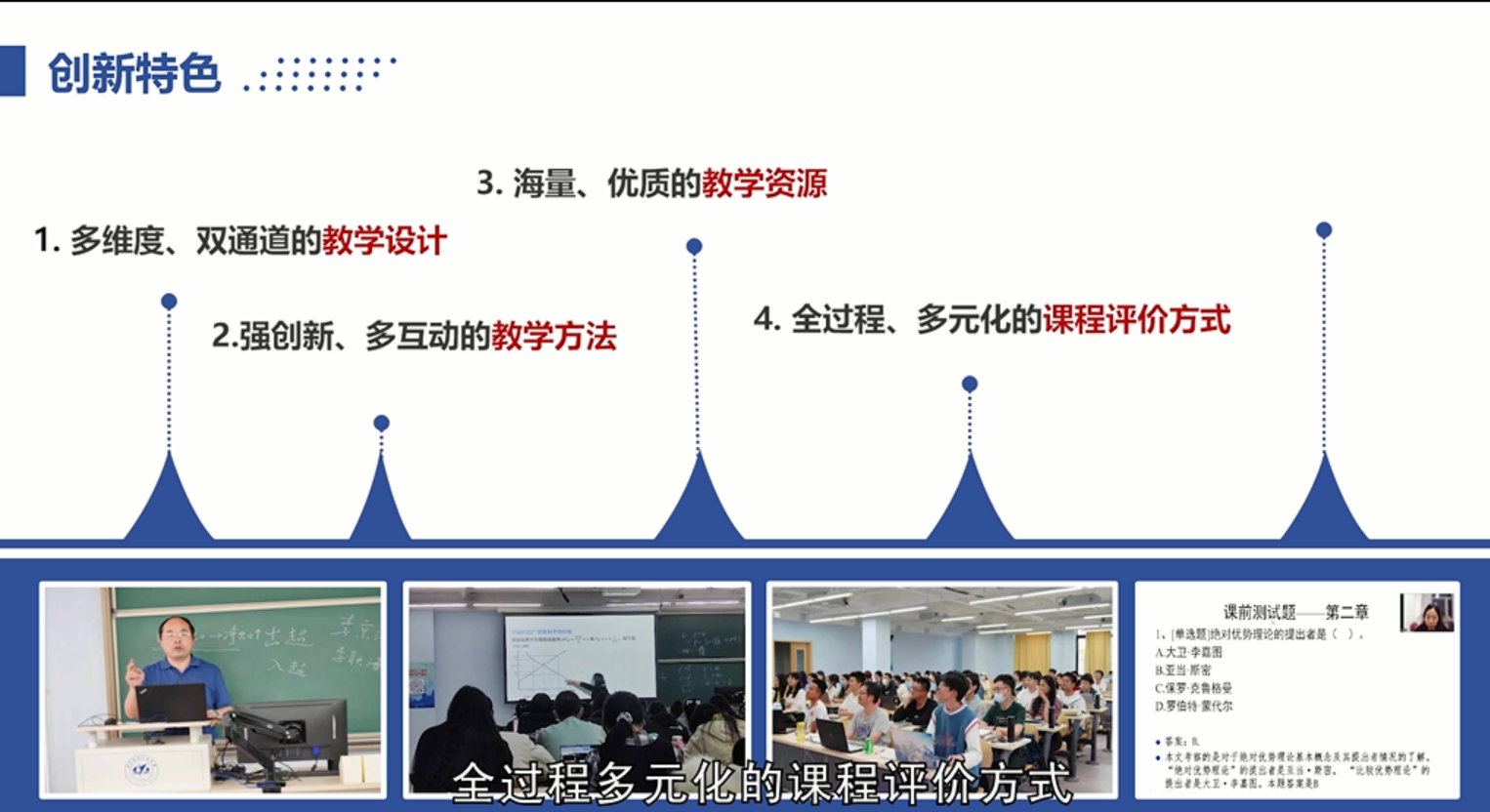 《国际经济学》:是公司首批建设的校级一流本科课程,也是公司第一门线上线下混合式专业课,课程负责人是胡庆江副教授,团队成员包括牛朝辉老师、韩霞教授、张丽教授。课程严格按照一流本科课程“两性一度”要求,实现了教学目标的高阶性、教学内容的创新性、教学设计的挑战度。课程构建了线上线下混合式教学模式;重构了教学内容与板块;制作了高水平、海量的线上线下教学资源;创新运用了“四位一体”的教学方法;构建了全过程、多元化的课程评价方式;开展了浸润式、融合化的课程思政。在公司一流本科课程建设项目的支持下,课程团队制作了高水平慕课并在智慧树上连续运行,出版了国际经济学教材,编写了课程习题集以及课程全套混合式教学大纲、教案、PPT、案例库、课程思政教学设计和教学案例等,发表了混合式教改论文和课程思政论文各1篇。