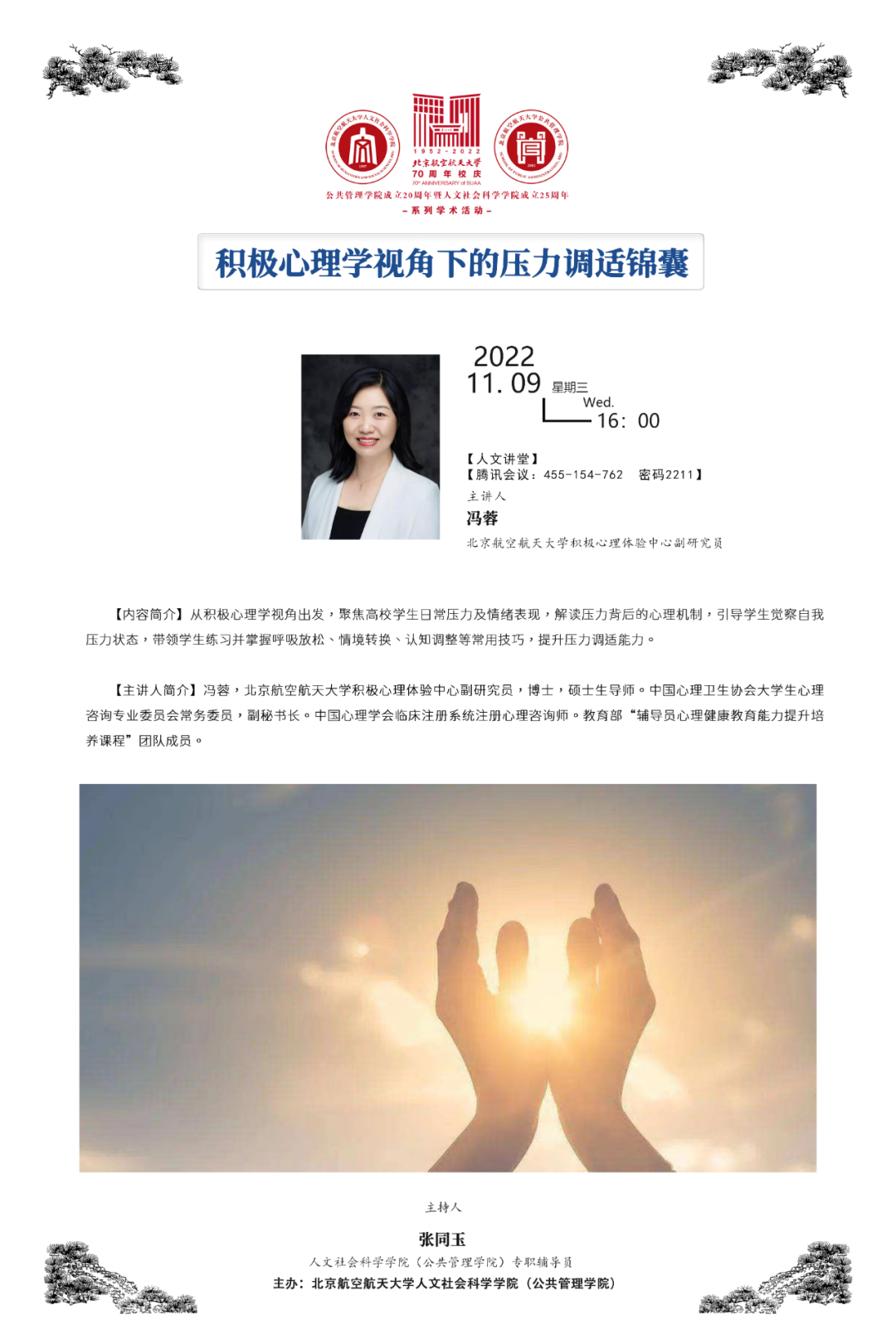 “毓秀人文”系列文体活动,助力人文人全面发展。恰逢建校70周年,研会成员积极参与献词团、主演校庆晚会等,积极承办校庆嘉年华外场、组织参与校运动会,航篮杯、航文杯篮球赛,“本草纲目”毽子操等众多体育赛事,增进与公司及其他院系的合作交流。举办“乐活人文·动力青春”人文嘉年华活动,促进师生关系,加强体育锻炼、提升身体素质。